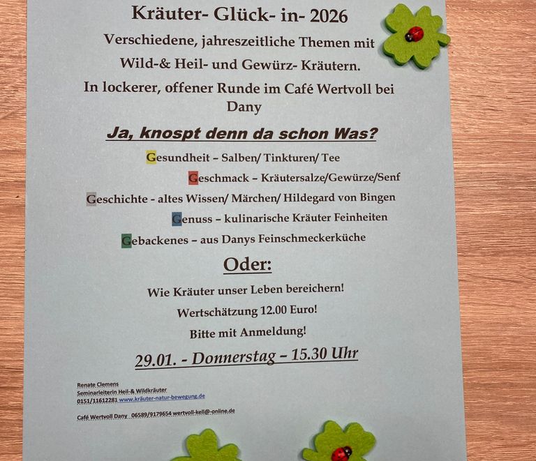 Kräuterstammtisch Donnerstag 29. 01. - 15.30 Uhr im Cafe Wertvoll "Knospt den da schon was?" Teilnehmer Beitrag 12.00€